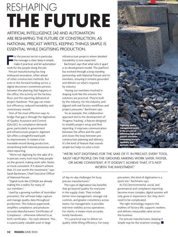 “We’re not digitising for the sake of it. In precast, every tool must help people on the ground, making work safer, faster, or more consistent. If it doesn’t achieve that, it’s not worth the investment,” says Sarah Bachmann, CEO of National Precast.